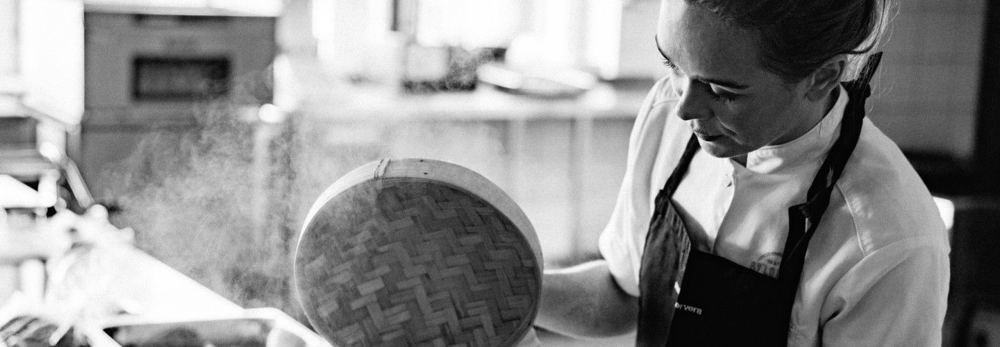 Kollage av två bilder. Den första en svartvit bild på Louise där hon i köket lyfter på locket till ångkokaren för att kika på dumplingsen. Den andra en bild på en färdig laab.