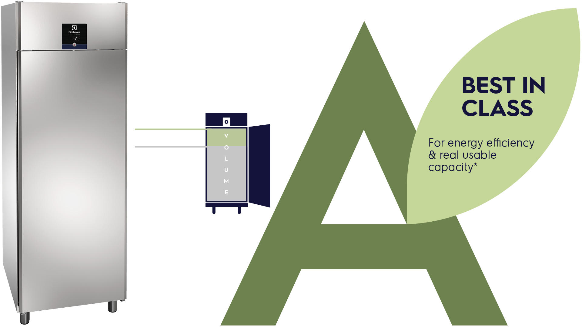 En professionell kyl står för en stor del av energiförbrukningen i köket. Därför är energieffektivitet avgörande – både för driftskostnader och klimatavtryck. Electrolux Professional Ecostore HPe 670L har högsta energieffektivitetsklass och erbjuder 50 liter mer tillgängligt utrymme än motsvarande modeller på marknaden*.