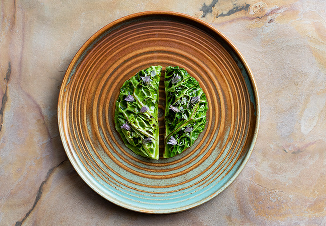 1. Bygg ”tacon” med lite gräddkokt kål i botten, strimlad bog sen lite lök samt panko, vik ihop, pensla ovandelen med gräslöksolja och garnera med några gräslöksblommor samt några flagor salt.