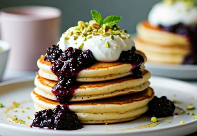 Amerikanska pannkakor med björnbär, gräddblandning och ljus sirap. Enkla att göra och perfekta för både brunch och dessert.