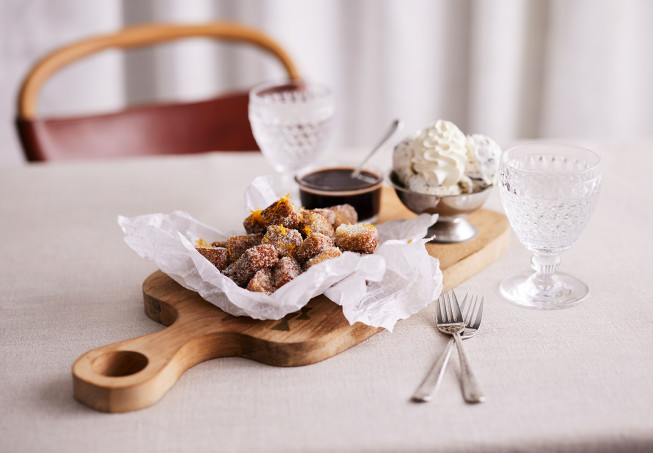 8. Blanda socker med finrivet apelsinzest. Vänd de nystekta bitsen i sockret och lägg upp på serveringsfat. Servera med vaniljglass, chokladsås och vispad Rama Visp 31%.