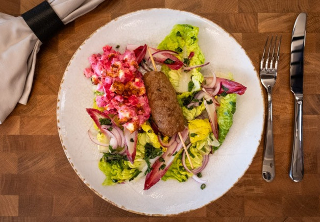 Fetaostgratinerad rödbetsgratäng med lammfärsspett och myntasallad