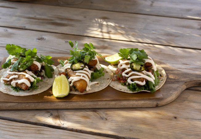 Fish taco med Pico de gallo, limeaioli, krispsallad, picklad jalapeño och koriander.