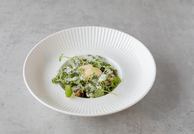 En italiensk-inspirerad vegetarisk rätt med svenska råvaror och säsong i fokus. Rätten består av nystekta kantareller, gnocchi på kulturspannmål, svenska vita bönor och gremolata på kallpressad rapsolja. Allt toppas med ett syrligt skum med brynt smör, riven svensk “pecorino”, och en varm och smakrik svampbuljong.