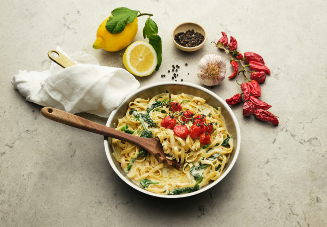 En sofistikerad, modern och vegetarisk variant av den svenska klassikern köttbullar med makaroner där naturlig sälta från oliver och frisk citruskräm lyfter smakerna till helt nya höjder.