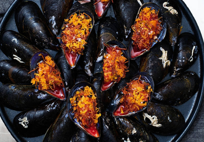 Gratinerade blåmusslor med smak av tomat och chili.