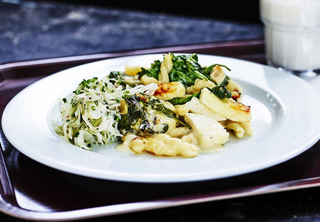 Vänd ner pasta, spenat och strimlad ost i såsen. Fördela i bleck och tillaga i ugn på 200° ca 10 min. Strö över riven ost och gratinera ytterligare ca 10 min.