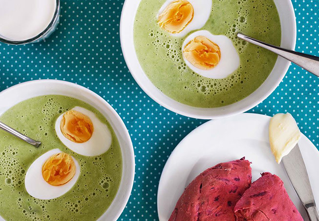 Grön ärtsoppa med ägghalvor och hembakat rödbetsbröd