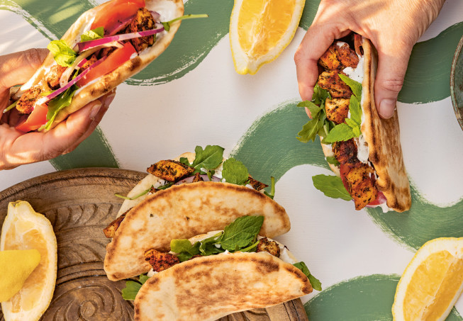 Vegetarisk streetfood i solen? Här bryts halloumi eller Grilloumi® i bitar som påminner om gyros. Ta de grönsaker du har och lägg lite citron bredvid så att var och en kan reglera syran.