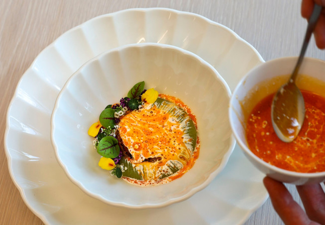 Pepparrubbad älginnanlår med tryffelemulsion, kaprisvinägrett, picklad shiitakesvamp och friterad potatis. Recept av Michael Andersson, Årets Kock 2024.