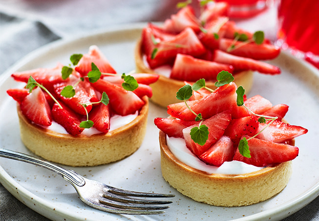 - Spritsa vaniljcrèmen i pajskalen och toppa med de rårörda jordgubbarna.