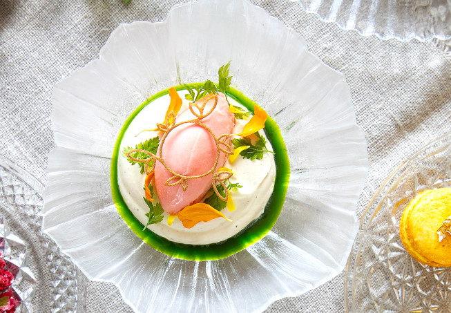 Blodapelsinsorbet, vispad kanelmousse och körvelolja.