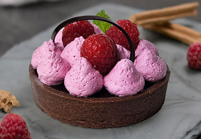 En delikat kakaodragerad mördegstartelett fylld med en krämig chokladcremeux toppad med lätt, fluffig hallonmousse som ger en uppfriskande kontrast till den rika chokladsmaken.