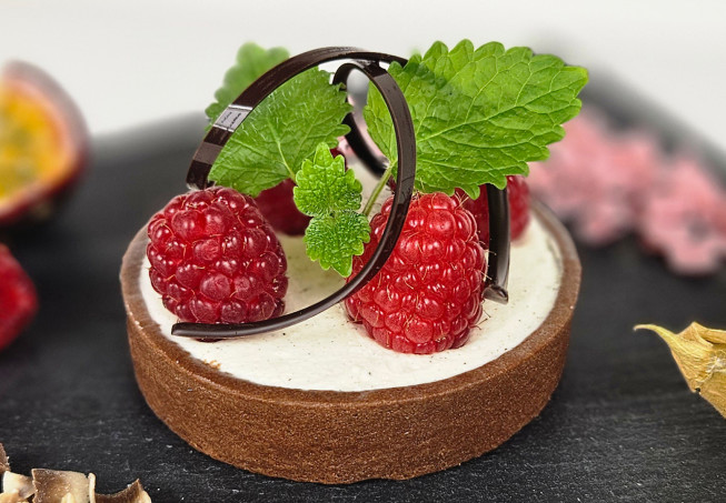 En delikat kakaodragerad mördegstartelett fylld med en krämig chokladcremeux toppad med lätt, fluffig hallonmousse som ger en uppfriskande kontrast till den rika chokladsmaken.
