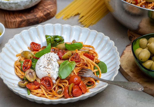 Denna utsökta rätt kombinerar de bästa smakerna från Medelhavet med salta och smakrika Halkidikioliver, söta soltorkade körsbärstomater och en generös mängd jungfruolivolja.