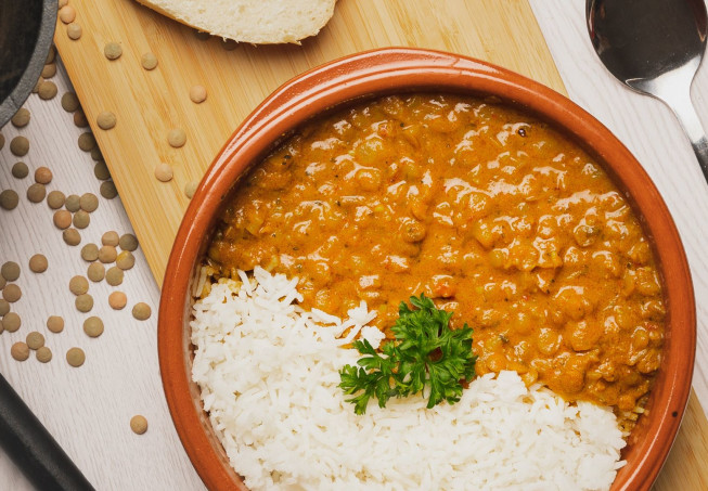 Rör ner kokosmjölk, vatten, örtagårdsbuljong, sköljda linser och sambal oelek.