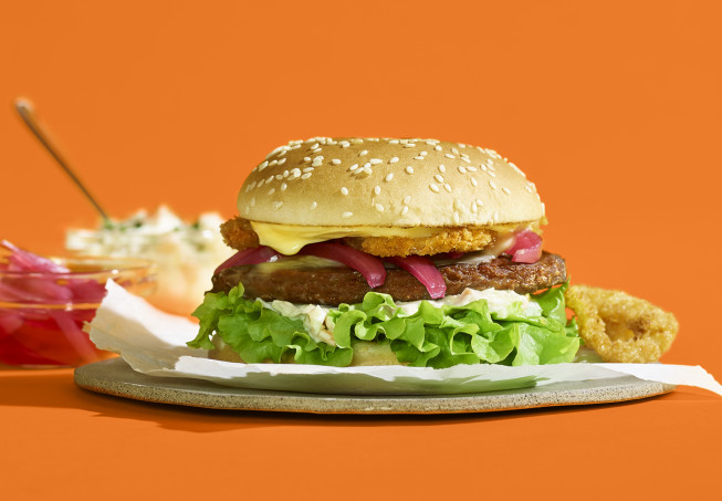 Förstekt burgare ger snabb och smidig servering utan att kompromissa med smaken. Denna burgare med lökringar, coleslaw och picklad rödlök är en riktig vinnare!