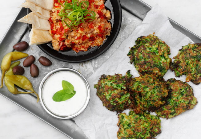 Meze är den sammanfattade benämningen för många smårätter, båda varma och kalla, som serveras som förrätt eller som en hel middagsbuffé. Det finns hundratals rätter som passar, här är ett utmärkt exempel!