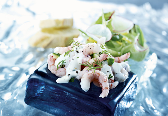 - Blanda ihop citronsaft & rivet skal, majonnäs, yoghurt samt dill. Tillsätt räkor, gurka och lök och smaka av med salt och peppar.