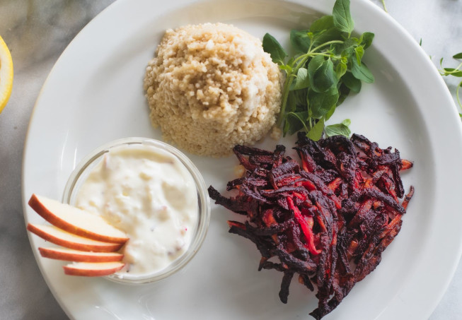Servera rödbetsrårakorna med couscous och äppeltzatziki.