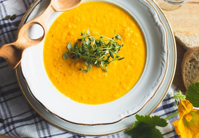 4. Mixa därefter soppan slät med en stavmixer. Tillsätt grädden och mixa lite till. Smaka av med salt och peppar.