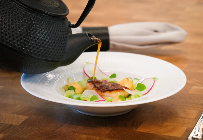 Sotad kolja med krispiga grönsaker och sojamajonnäs i lakritstebuljong, perfekt att servera som förrätt. Rätten är en smakupplevelse som kombinerar havets smaker med en twist av lakrits. Den sotade koljan ger en rökig och fyllig smak, medan de krispiga grönsakerna tillför en fin textur. Sojamajonnäsen binder samman rätten med sin krämiga konsistens och umami-toner, och lakritstebuljongen ger en subtil sötma och aromatisk djup som förhöjer hela måltiden. Perfekt för den som vill utforska nya smakdimensioner!