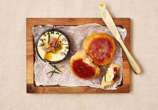 Honungssmör med friterad rosmarin och gräslöksblommor