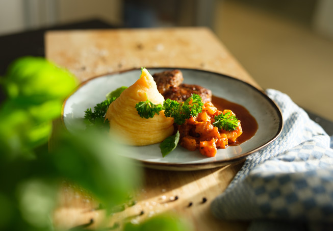 En smakrik och saftig rotfruktsbiff som består av hälften nötfärs och hälften rotfrukter. Rätten baseras på Rotfruktsmix höst- och vinterbas, en välbalanserad fintärnad mix som ger en mörk mustig smak och kompletterar animaliskt protein. Klockren i färsrätter men också utmärkt i såser, grytor och soppor.