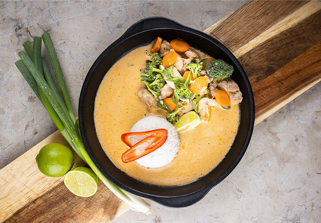 God och krämig kycklinggryta med smaker av chili, ingefära, lime och röd curry. Servera med ris eller äggnudlar.