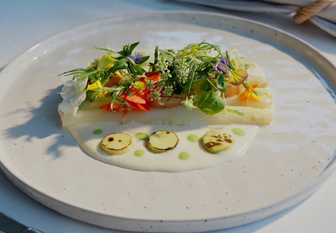 1. Lägg velouté i mitten av tallriken, placera sparris, potatis och blomblad ovanpå.