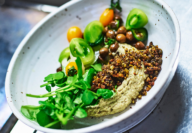 Falafel på baljväxtfärs, yoghurt, picklade tomater, mynta och blad.