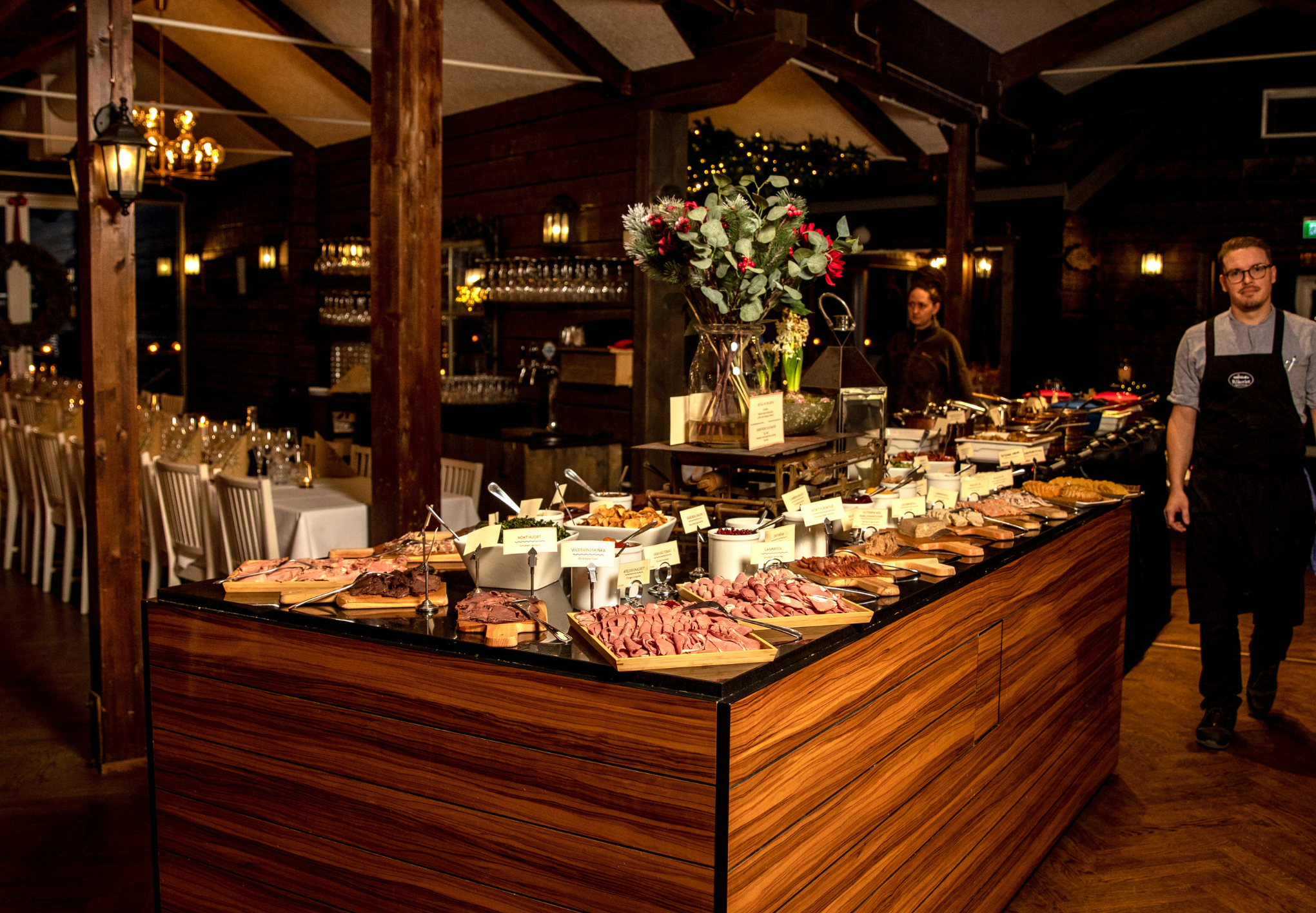 –Vi kommer inte göra så stora förändringar från förra året – vi har ju eget rökeri så det blir mycket rökt, så klart. Vi röker allt som går; kött, mejeriprodukter, fisk, räkor, rom med mera. Bara du vet hur råvarorna beter sig är det inte så svårt att röka. Förra året rökte vi en karré till charkbordet som var väldigt uppskattad. Fem av sju produkter på charkbordet gör vi själva från grunden. Vi gjorde också egen vegetarisk chark där vi bland annat saltbakade morötter och kålrötter för rätt textur som vi sedan doppade i en rökig olja. Roliga rätter som verkligen uppskattades av våra gäster, både vegetarianer och övriga, säger Marcus.Fjäderholmarnas Rökeri har ett traditionellt uppdukat julbord med ett sill- och fiskbord, chark och småvarmt för sig och ett helt eget rum med efterrätter, ost, kakor och godis. Varmrätter som grisfötter, hemgjord blodpudding och lutfisk beställs i luckan precis bredvid det varma bordet.