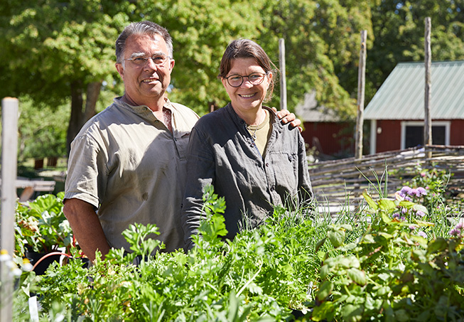 ”Vissa grödor ska vi alltid odla, som potatis, äpplen, jordgubbar och rabarber. Men varje år testar vi också att odla något nytt. Jag lämnar önskemål utifrån vad för rätter jag vill laga, vad som känns kul och vad jag är nyfiken på. Sedan forskar Margareta och Göran i om det skulle fungera”, fortsätter Jonas.