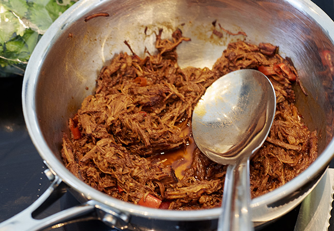”Spetsbringan är en långbrässerad texas chili-variant med mycket kakao, chili och även dillfrö för att få fram en mer pikant smak. Här använder jag även chilifrukter, lök och vitlök. Spetsbringan är grovfibrig och faller sönder i grova härliga fibrer när den brässeras i ugnen. Köttet toppar jag sedan med en rödkålssallad och ingefäsyoghurt för att få ännu mer syra i rätten. Avslutningsvis lägger jag på stora mängder koriander.”