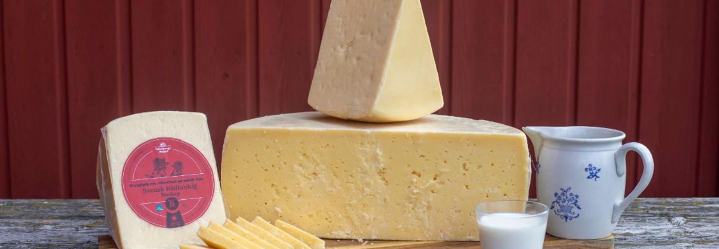Rödbrokig är en grynpipig ost med en säregen smak och krämighet. Gjord på mjölk från svensk röd och vit boskap i Falköpingstrakten.