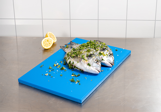 Fisk och skaldjur trivs inte på land. Välj den blåa skärbrädan.