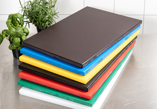 Färgkodade skärbrädor gör det enkelt att säkerställa en hög hygien i köket. Varje färg är tänkt för ett särskilt användningsområde, som ska vara lätt att komma ihåg. Var noga med att rengöra dem efter användning som vanligt. De är lättavtorkade och funkar bra att diska i diskmaskin. Till skärbrädorna finns ett tillhörande ställ i stål.