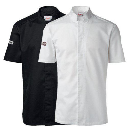 Uppdatera köksgarderoben med en kortärmad kockrock håller dig sval under intensiva arbetspass. Våra kockrockar har en modern, smalare passform och flera praktiska detaljer. För en stilren look är knäppningen dold med tryckknappar och den är tillverkad i ett elegant vitt twilltyg av en hållbar polyester och bomullsblandning. Rocken är broderad med Martin & Servera-loggan på höger ärm och har funktionella detaljer som en ögla i nacken för enkel upphängning. Tål att tvättas i 85°C.Läs mer Visa mindre